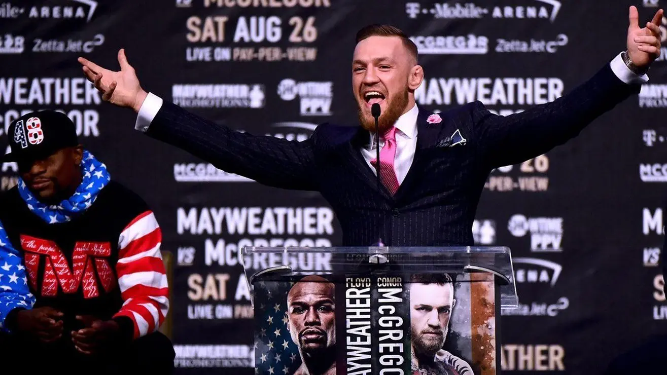 An artful trash-talker, McGregor wasted little time tearing into Mayweather’s clothes and troubles with the tax man. McGregor was dressed for the occasion, wearing a custom-made suit, and quickly chided Mayweather for his lackluster appearance saying, “He’s in a f—ing track suit. He can’t even afford a suit anymore.”