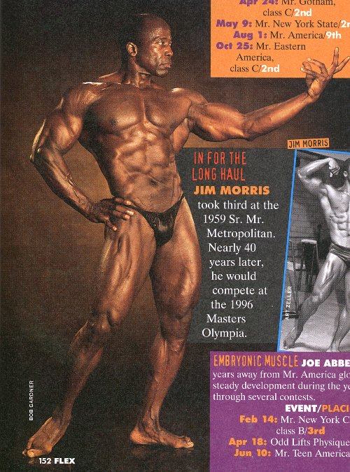 Although Jim Morris made his bodybuilding debut with a third-place finish at the 1959 AAU Mr. New York Metropolitan, he did not compete for the next eight years for various reasons. However, he re-entered the bodybuilding scene with a bang in 1967, finishing eighth at the 1967 AAU Junior Mr. America and winning the 1967 AAU Junior Mr. USA and Mr. New York Metropolitan title.