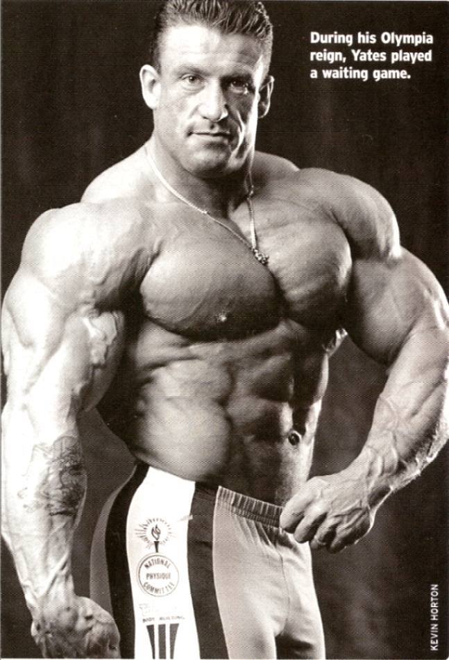 In 1991, Yates was the runner-up at the Olympia to Lee Haney, who duly won his eighth record-setting Sandow and the retired. From 1992 through 1997, Yates dominated the sport’s highest title. In 1994, he overcame a torn biceps to win the crown. In 1997, his most valiant victory came when he tore a triceps three weeks before the contest, but still battled on to triumph. Due to the injury, Yates was forced to retire, with a pro record of 15 wins and two second-place finishes.