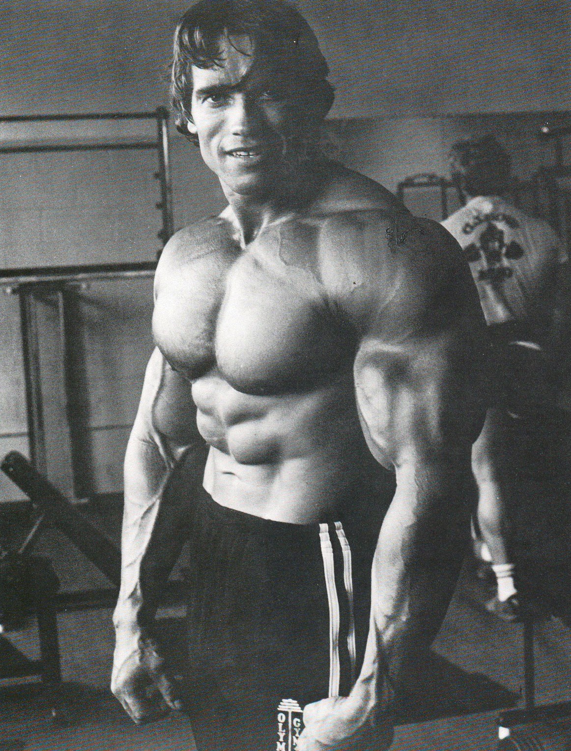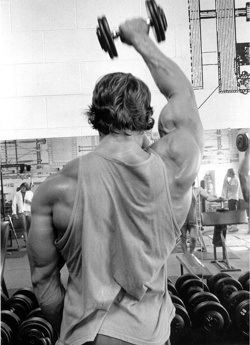For lateral and posterior deltoid development, Schwarzenegger relied on dumbbell lateral raises and incline lateral raises. He credits the technique of doing incline lateral raises to Vince Gironda’s gym.
