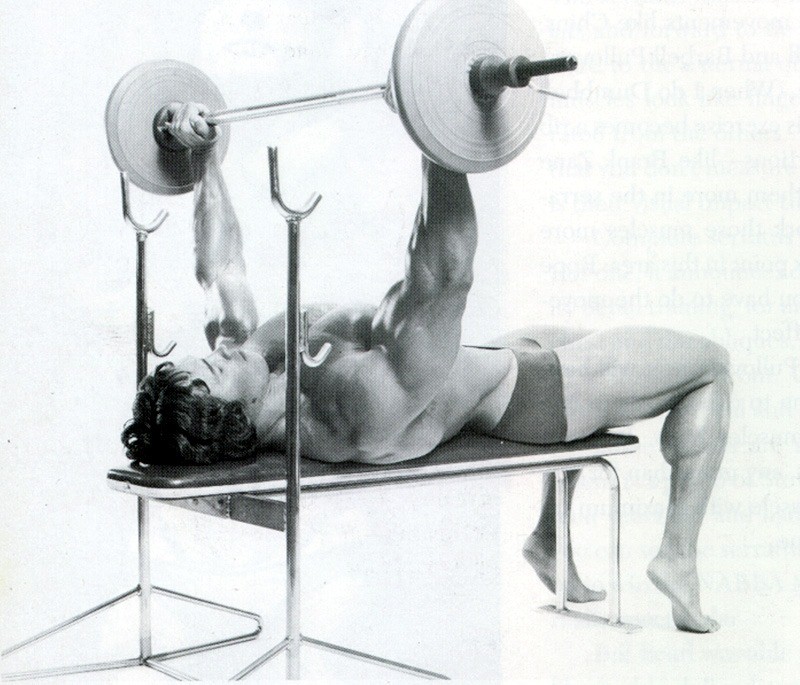 Regarding the chest, Arnold leans heavily toward three exercises for development – Bench press, incline presses at different angles, and dumbbell chest flyes.