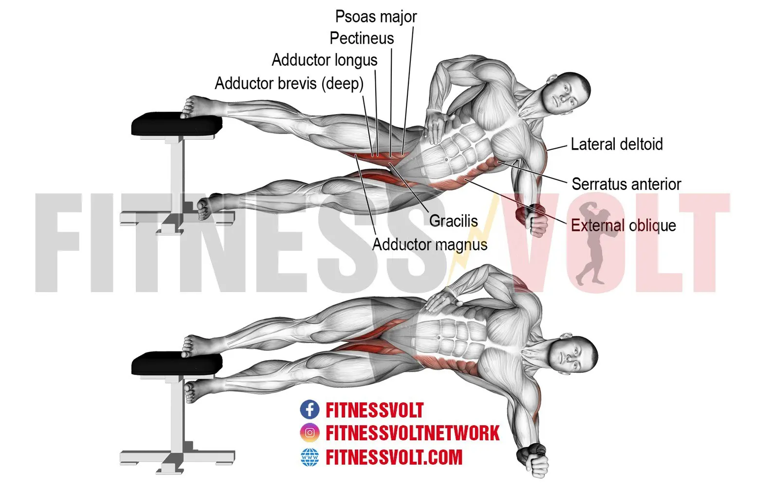 The side plank hip adduction, or hip adduction oblique bridge is a very effective exercise which strengthens and builds muscle in the hips and core. Now, you don’t need any weight to do this exercise but you will need a bench and possibly a floor mat or something soft to make the exercise more comfortable. But, it’s important to learn the technique to get the most effective workout possible.