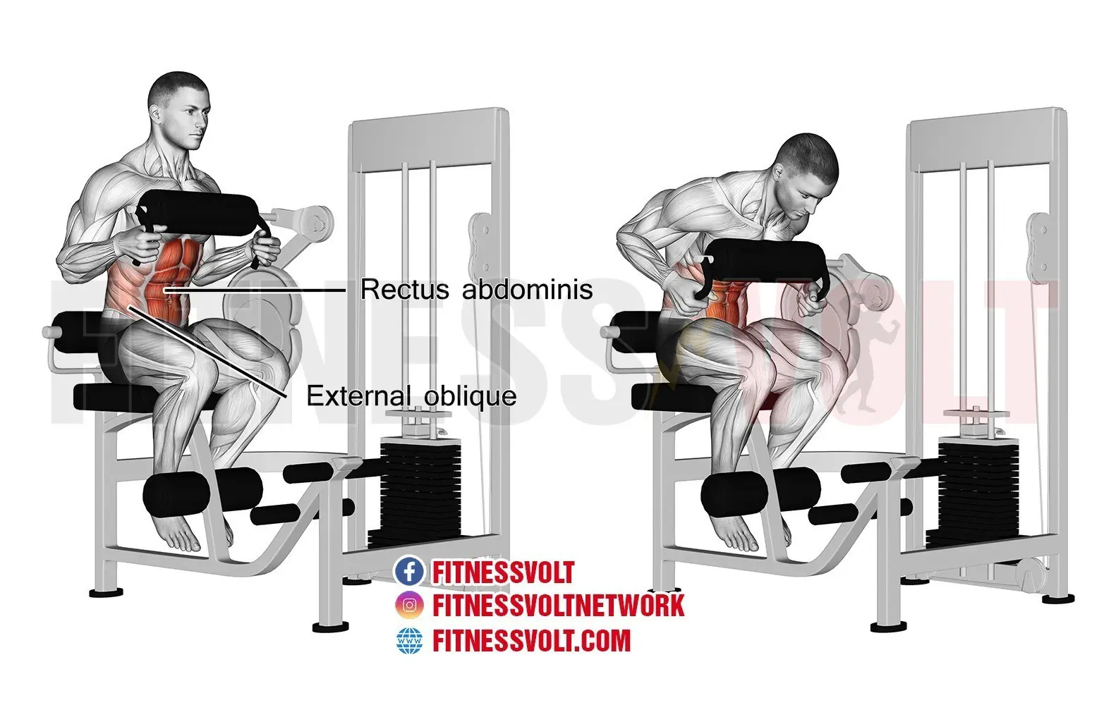 The machine seated crunch is an effective isolation exercise for building strength and muscle in the rectus abdominis (Abdominals). But the obliques get worked secondarily as the seated crunch is a great overall core exercise. Now, since there are so many different types of seated ab machines, everyone will have a different experience as opposed to a conventional free weight or cable exercise.