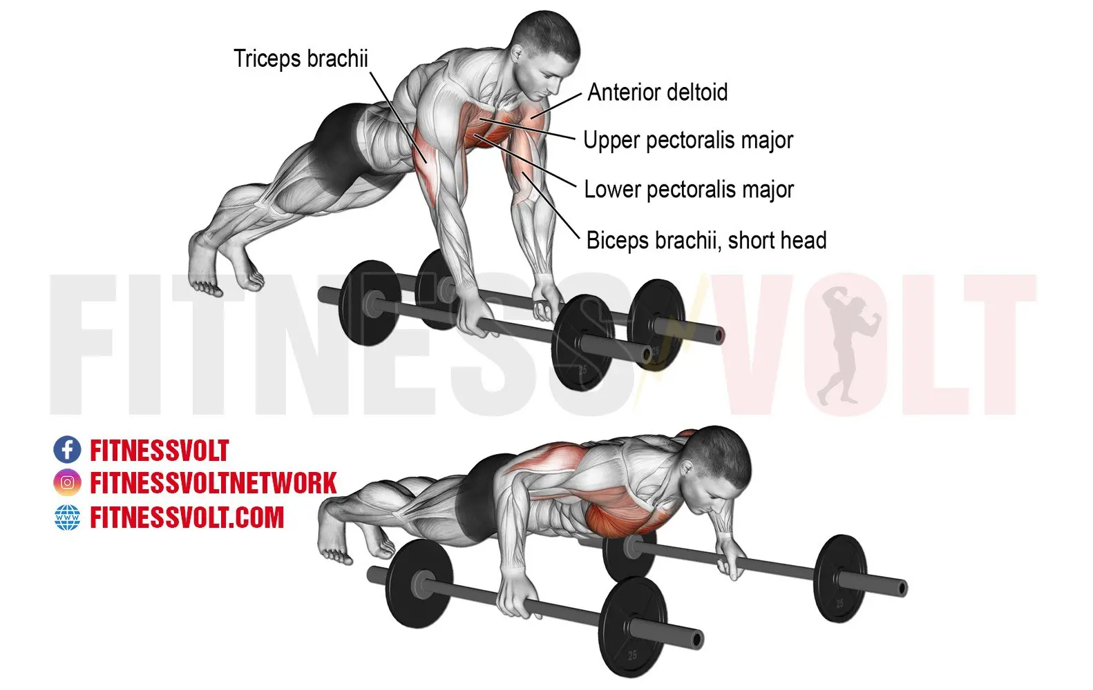 - Now, slowly bring the barbells back together until you’re back in a push-up position. Exhale during this portion of the exercise.