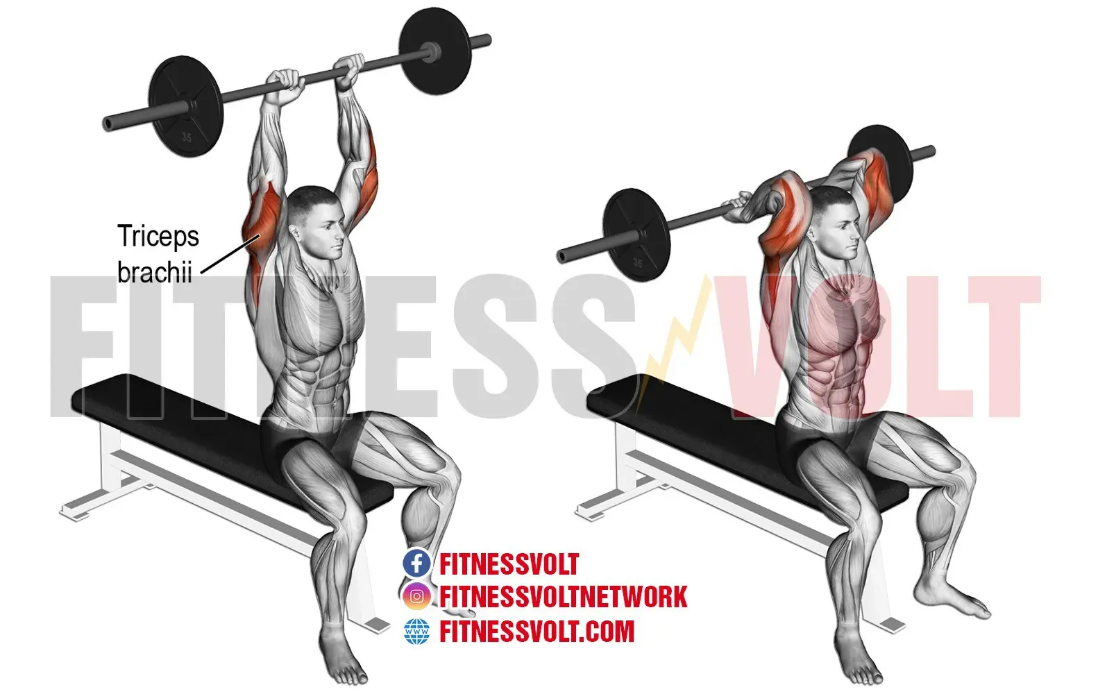 The overhead barbell tricep extension is also known as the French press, and it’s a very effective isolation exercise for working all three heads of the tricep muscle. Now, there are many ways to do this exercise but barbells load the triceps with the most amount of overall resistance load.