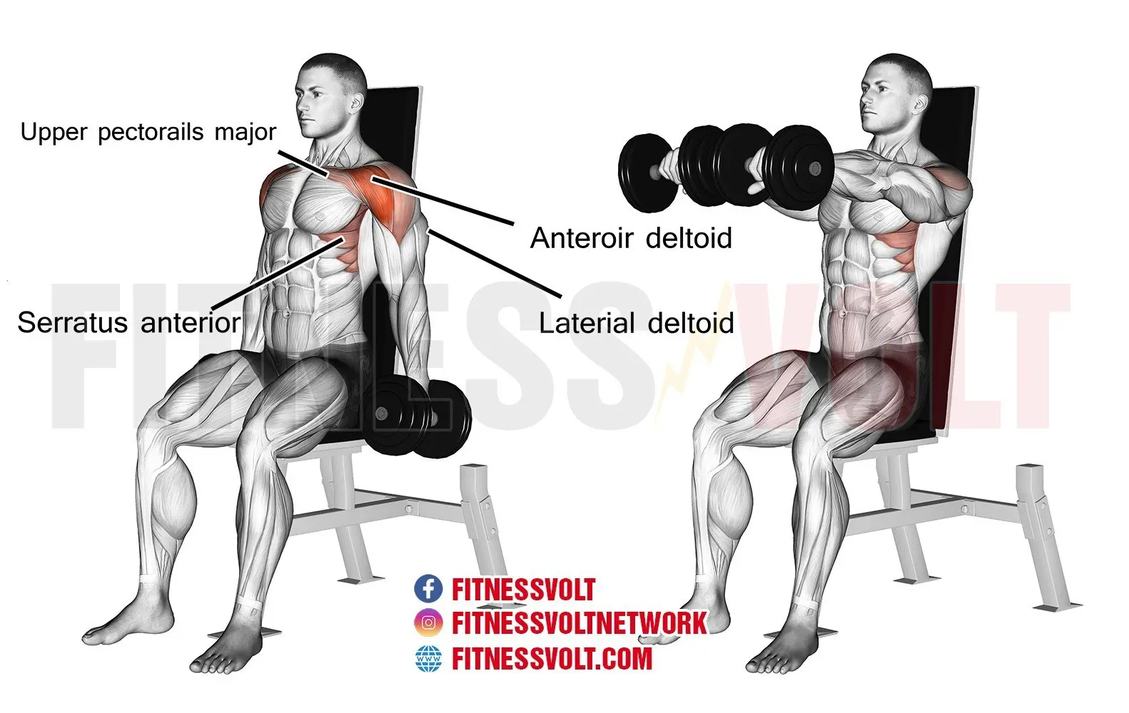 The seated dumbbell front raise is an isolation exercise for the anterior (Front deltoids) and it’s a great muscle and strength builder. The front shoulders are involved in most chest exercises and they receive a lot of stimulation but isolation work is good for really targeting the muscle to stimulate extra fibers.