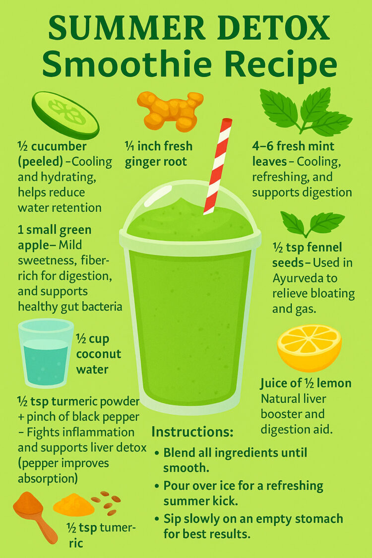 - ½ cucumber (peeled) – Cooling and hydrating, helps reduce water retention.