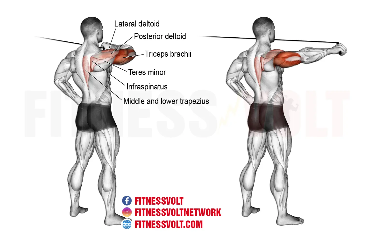 - The cable rear drive works the triceps and rear deltoids all in one movement.