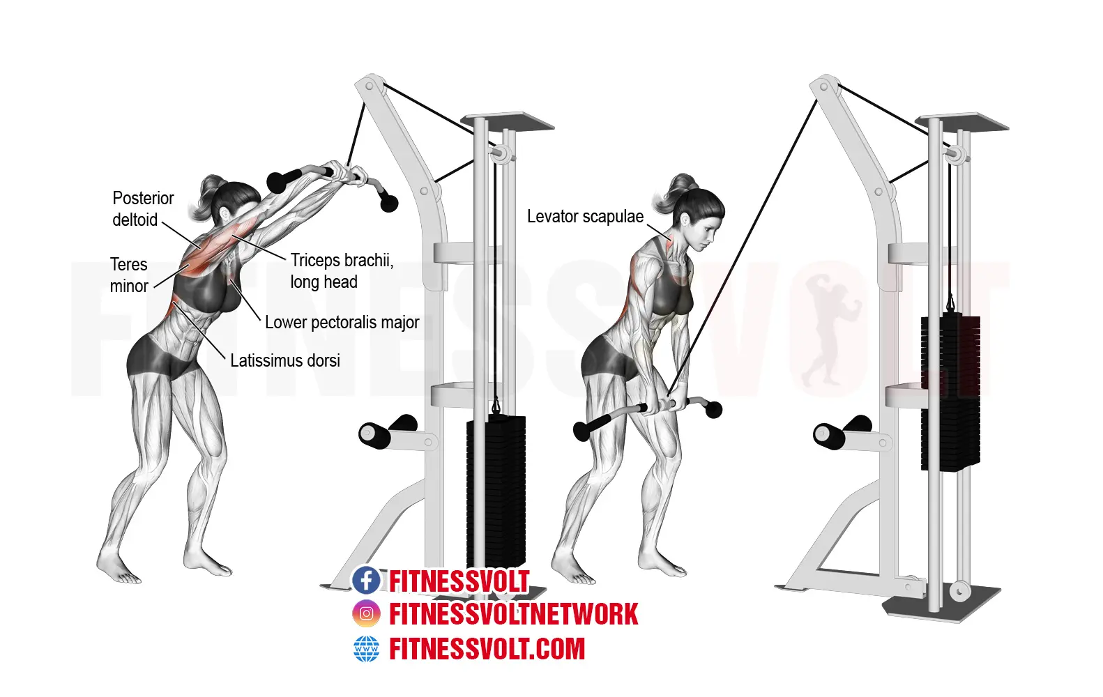 While this isn’t set in stone, we recommend 3-4 sets of 8-12 reps for the cable straight arm pulldown. This way you’re not using too much weight which could throw off your form and cause you to recruit other muscles, taking away from the intended purpose of the movement.