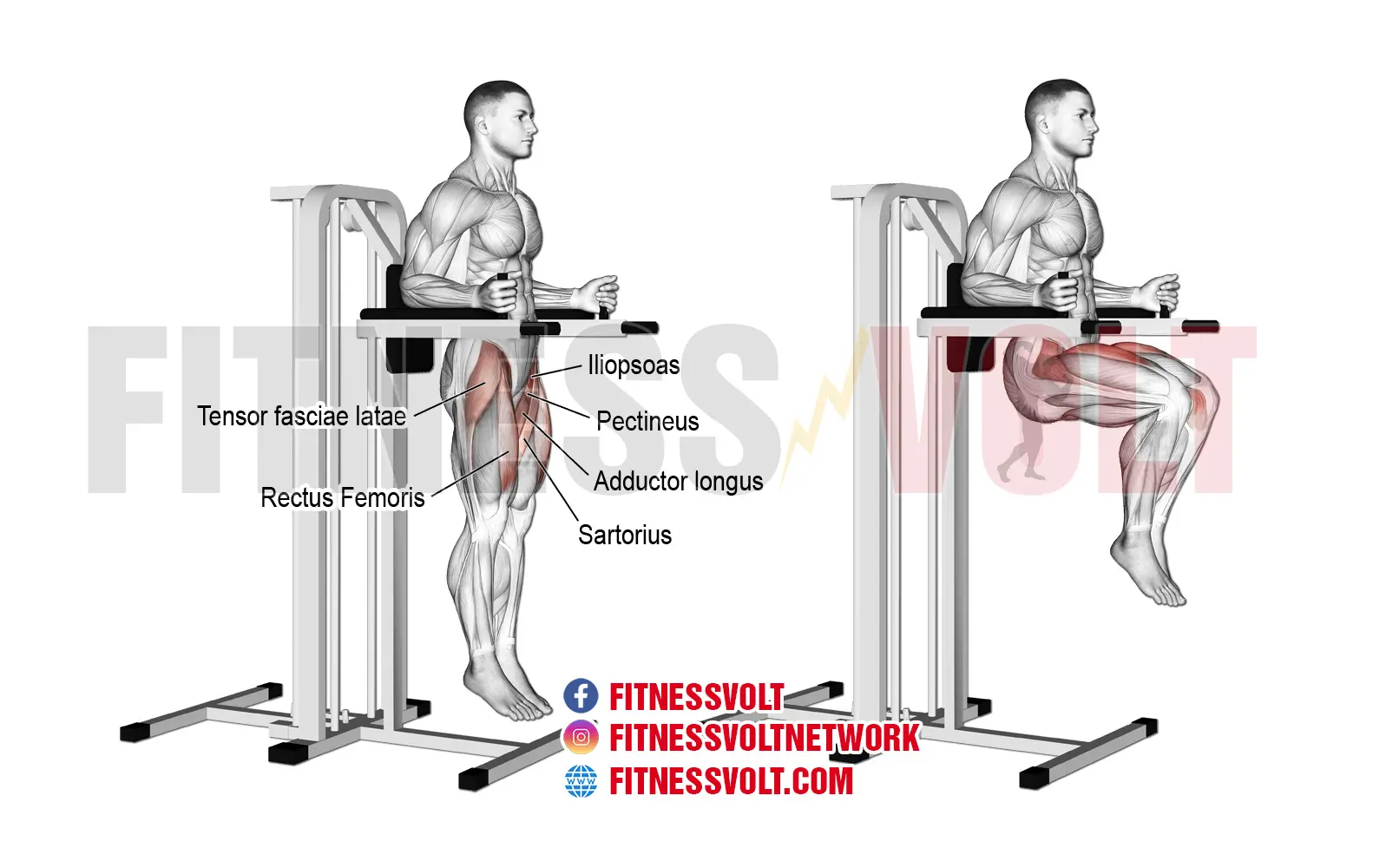 - The Captain’s chair leg raise is a great way to train your core and lower abdominals along with your hip flexors.