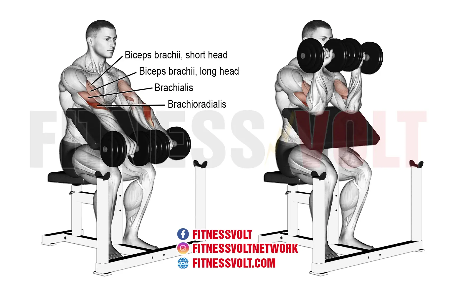 The dumbbell reverse preacher curl is an isolation exercise which effectively builds muscle and strength in the brachioradialis (Upper forearm), but the brachialis and biceps receive heavy stimulation as secondary movers. Now, this is a pretty simple exercise to do but you want to make sure you have proper form to prevent injury and get maximum results.