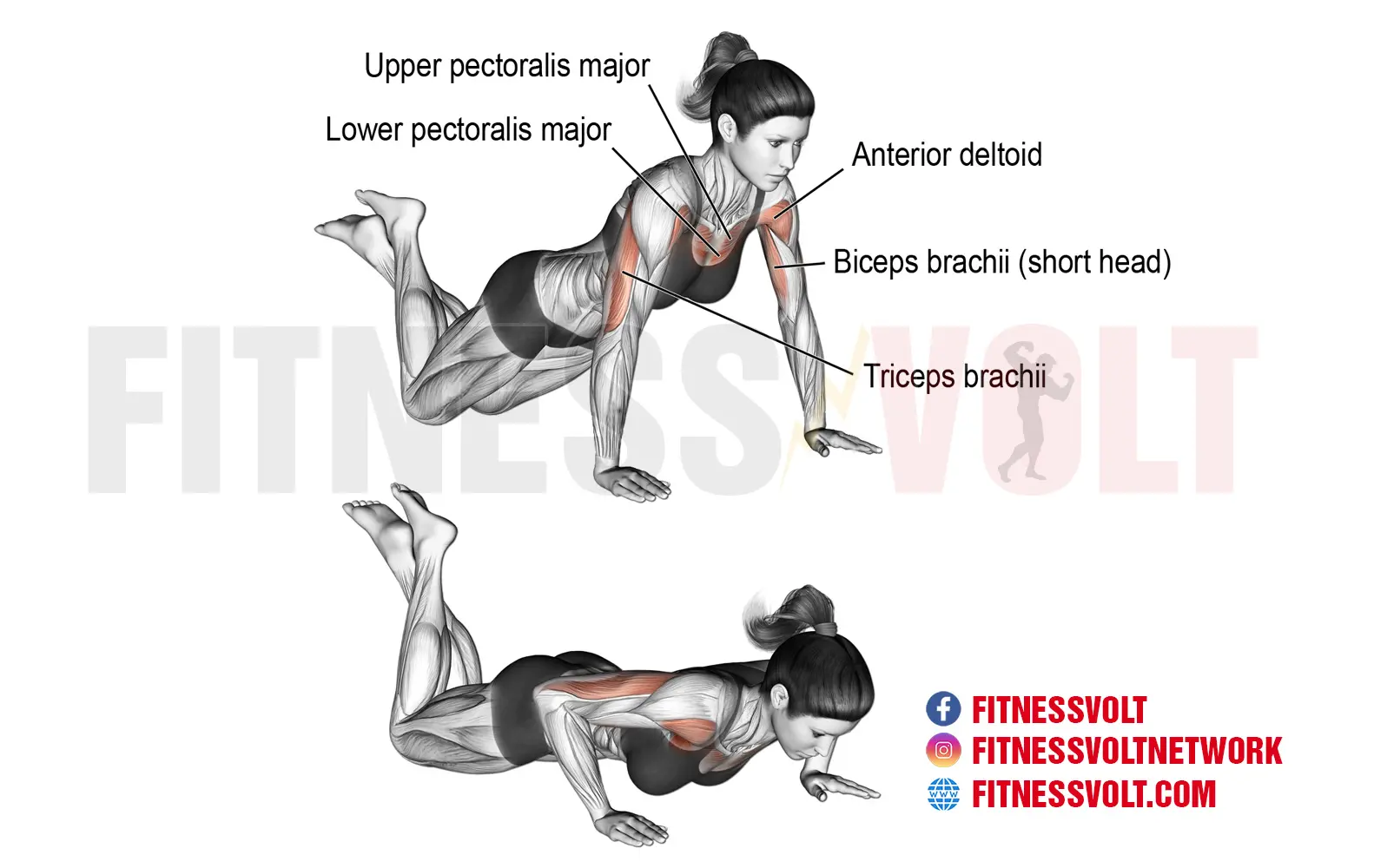 The knee push-up is a compound bodyweight exercise which builds muscle and strength in the chest muscles. But, the triceps and anterior deltoids also get plenty of stimulation as secondary movers. The knee push-up is convenient because you don’t need any equipment. But, it’s perfect for beginners who do not have sufficient upper body strength.