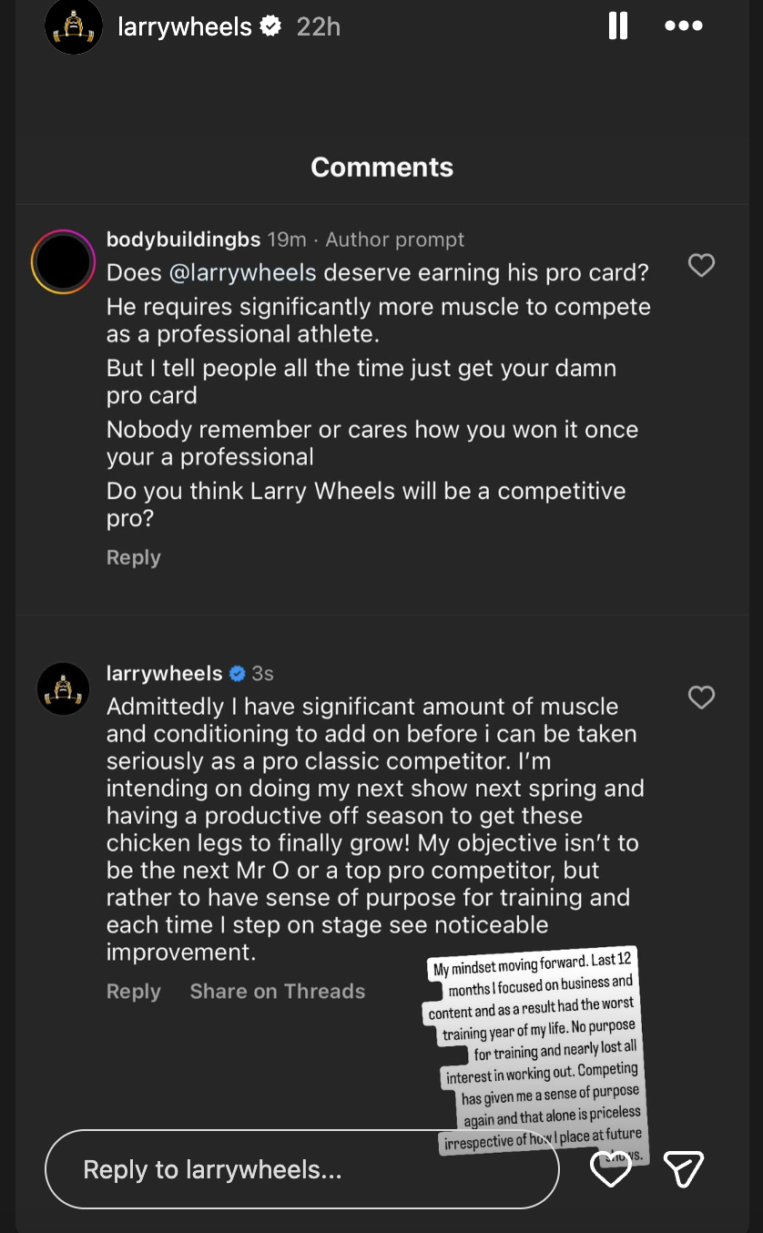 Larry Wheels talked about his future in bodybuilding on Instagram, sharing a story with his reply to a comment about the physique that secured him the IFBB Pro Card. Larry revealed that there is still a lot of work to be done, but also that competing has revitalized his life and motivation. As a part of his statement, Larry wrote that he plans to compete next spring, which led fans to believe that he is talking about the 2026 Arnold Classic.