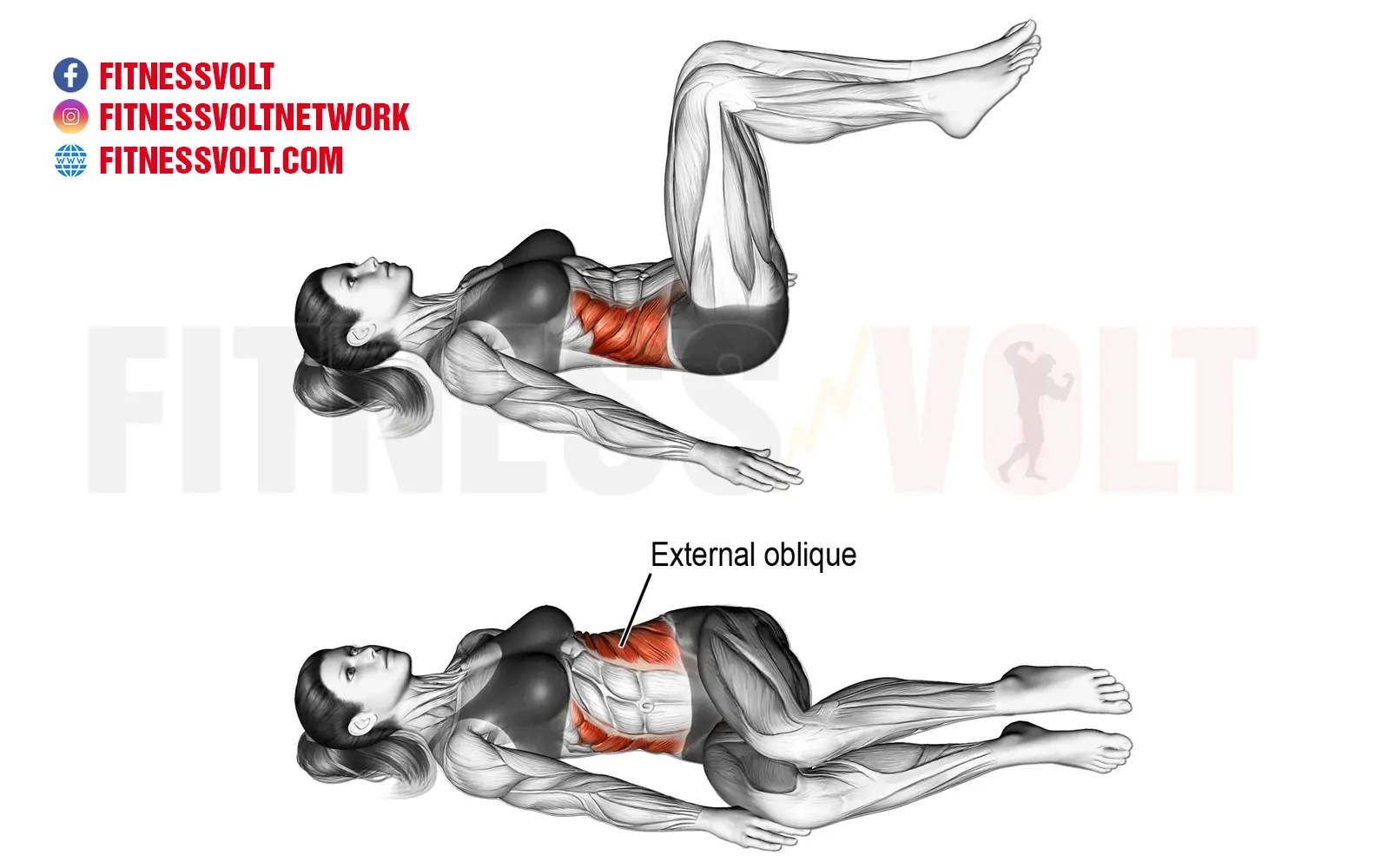 • The lying bent-knee oblique twist works the obliques.