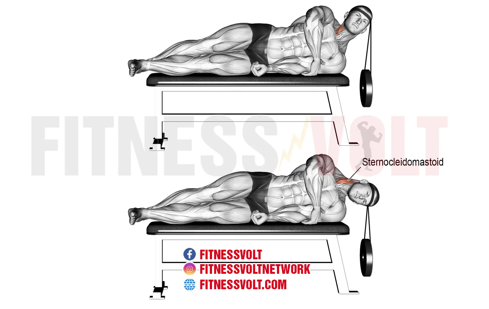The lying weighted lateral neck flexion is an exercise which builds muscle and strength in the sternocleidomastoid (Neck) muscle. Now, it’s not the typical gym exercise and you likely won’t see anyone doing it but it does have a functional purpose. Having a strong neck is important for sports with high impact and having a muscular neck is also desired among many lifters.