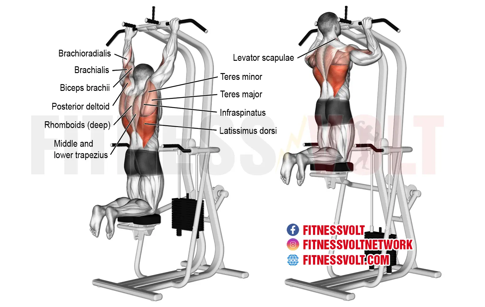 The machine-assisted pull-up is a great movement which effectively targets the latissimus dorsi muscles of the upper posterior chain. It’s an ideal exercise for people who lack optimal upper body strength. And it’s also beneficial for developing the strength and muscle necessary for performing the movement without assistance.