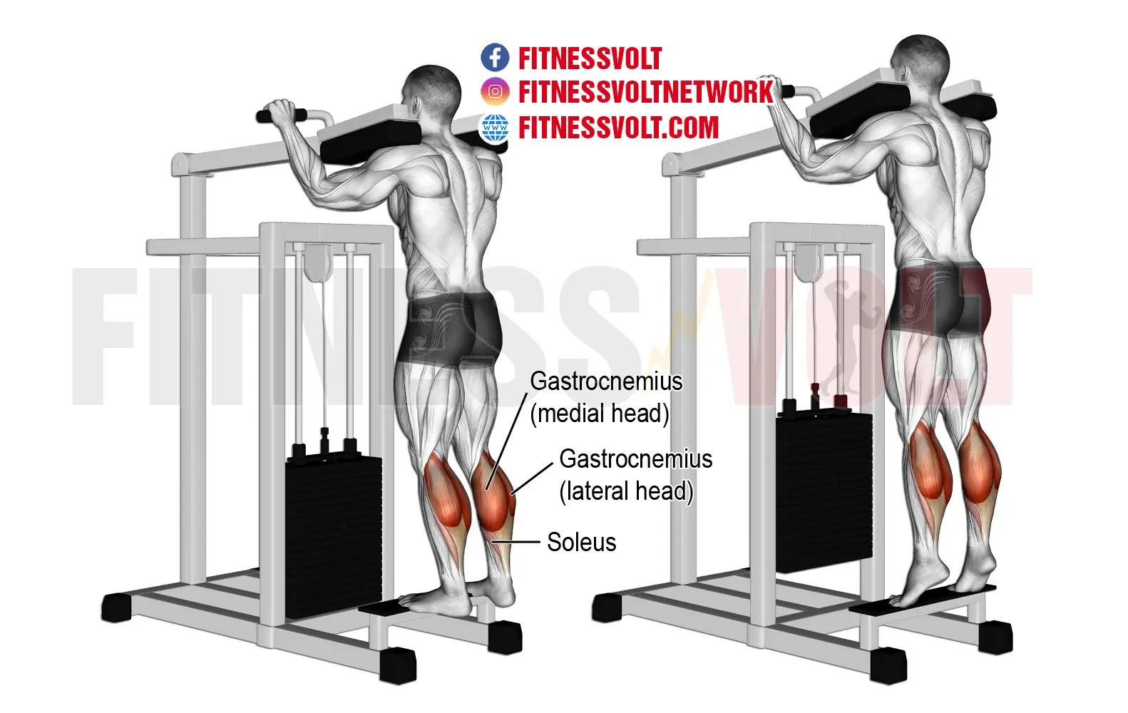 The machine standing calf raise is an isolation exercise which builds muscle and strength in the gastrocnemius and soleus muscles which make up the calves. Now, calves are a tricky muscle to train since they need a lot of heavy stimulus and consistency to get them to grow.