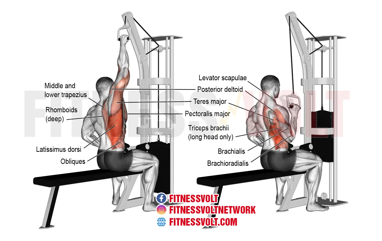 The one-arm lat pull-down is a compound exercise which builds muscle and strength in the latissimus dorsi muscles of the back. These muscles are activated optimally through pull-down and pull-up type movements so they need to be utilized for maximum gains. Now, performing this exercise using one arm develops unilateral strength and muscle balance so it’s always a great idea to do one-arm movements.