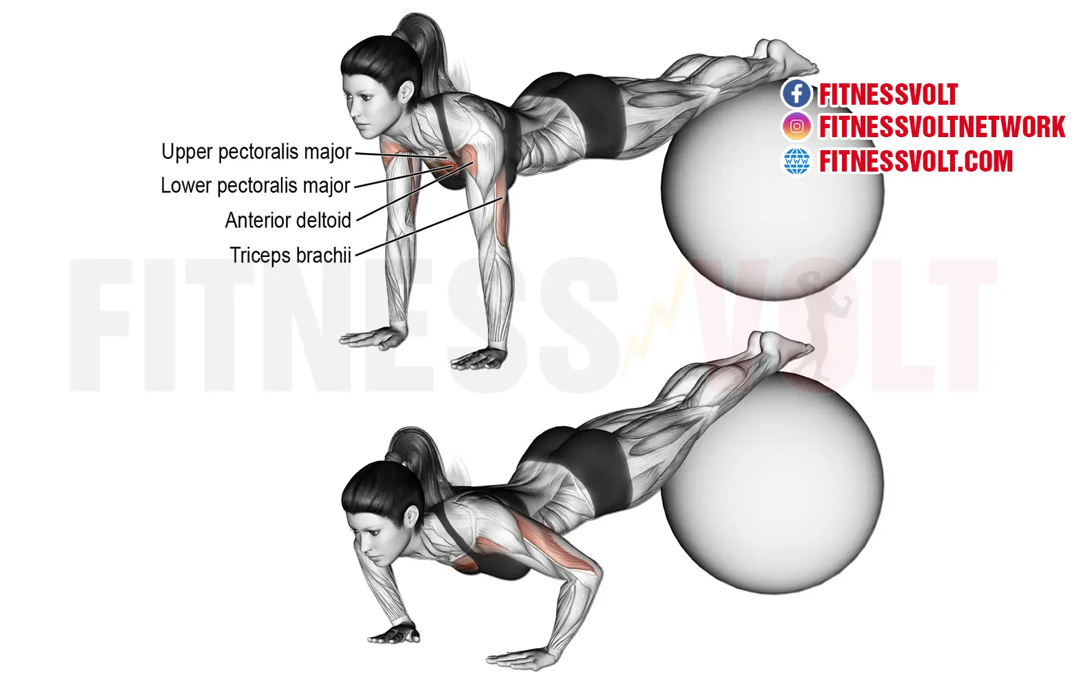 - The stability ball decline push-up targets the chest primarily and the triceps, shoulders, and core secondarily.