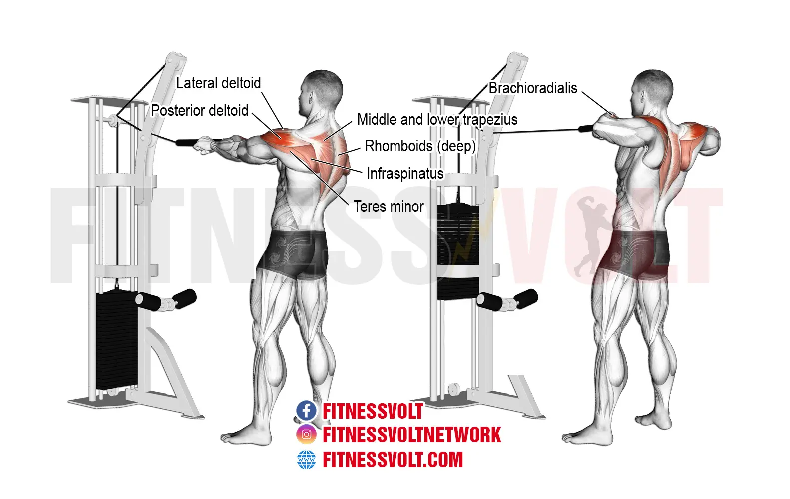- The standing cable rear delt row with rope targets the rear deltoids primarily but it also works the rhomboids (Upper back) and traps as secondary muscles which are activated during the exercise.