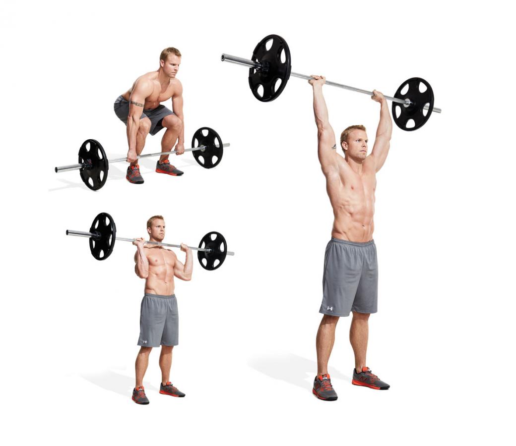 - Slightly dip your knees and drive the bar overhead by extending your arms and legs simultaneously.