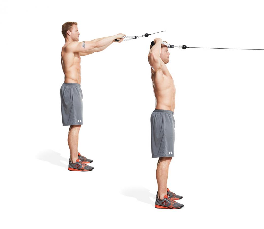- Stand facing the machine, feet shoulder-width apart, grasping the rope with an overhand grip and arms fully extended.