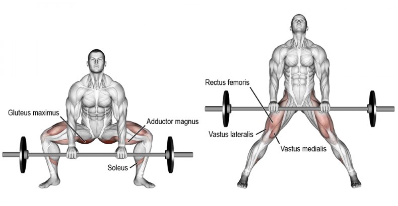 - Start by standing with a wide stance, feet pointed slightly outward, and a barbell positioned over the middle of your feet.