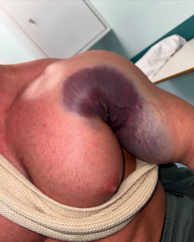Initially, Barnes avoided emergency surgery due to long hospital wait times, but when he woke up to see his chest, shoulder, and forearm turning purple, he knew it was serious. The first consultation revealed his pec major had torn 11cm away from where it should have been attached.