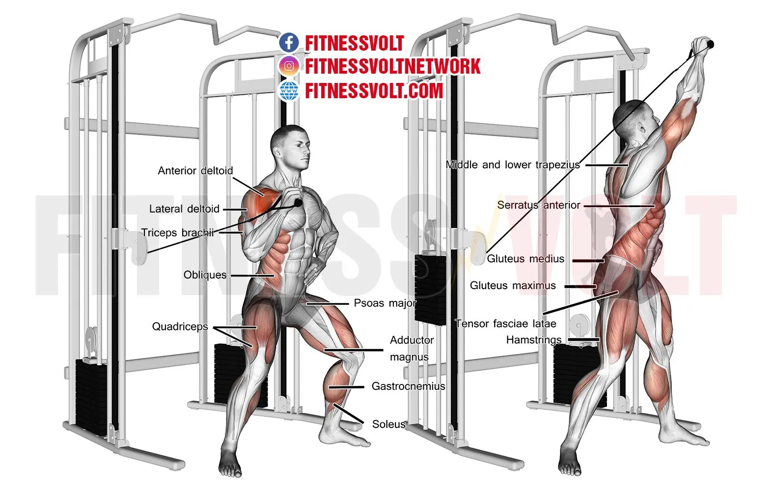 - Then, grab the cable with your right arm and perform the exercise by twisting your torso to the left while pressing the cable overhead.